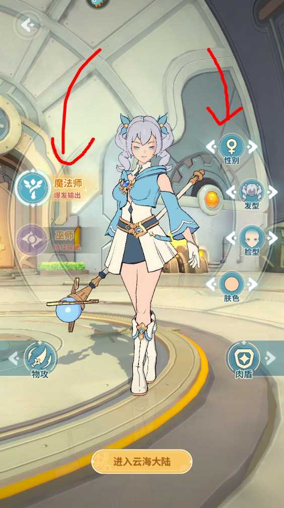 4、每个大类都有两个小职业,比如法攻就分为魔法师和巫师,还可以调节性别、发型什么的。