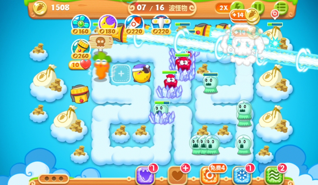 这一关的隐藏机制在于宝袋道具的连锁反应。当咱们清理掉第一个钱袋后,会触发隐藏的炮塔奖励,比如随机出现魔法球或手电筒。记得优先升级主干道的冰冻炮,它能大范围冻结怪物,给输出塔争取时间。右侧道路放两个火炮支援就够了,中间路径的怪物比较密集,可以适时使用冰冻雨或圣光斩来控场。道具的使用时机很关键,比如最后一波怪物冲锋时,冰冻雨能瞬间冻住全场,配合圣光斩的清屏效果简直无敌。