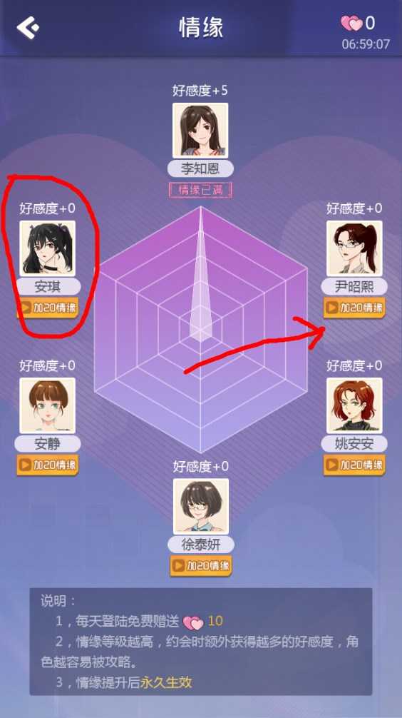 5、初始给10颗爱心,只加5好感,耗完之后破解版的功能会出现角色下方。你会发现,原本每天才加5好感,破解版可以让你第一天就把情缘拉满。